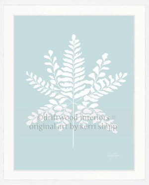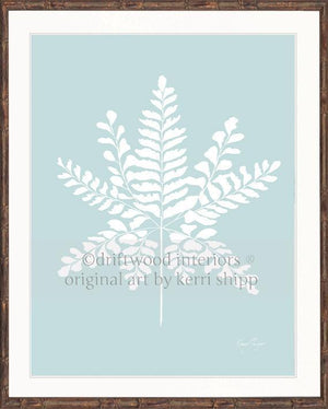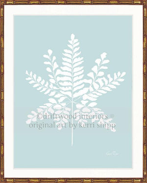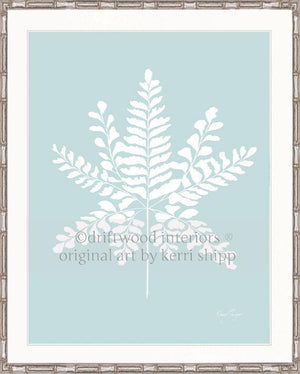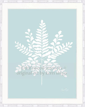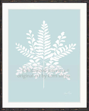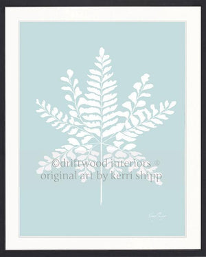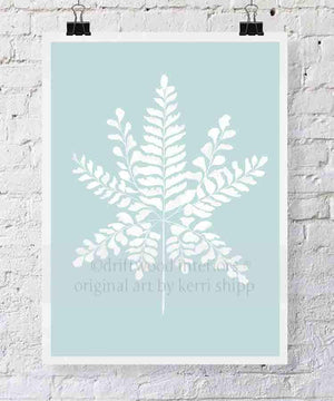Delicate fern foliage is a favourite subject of mine to paint. These are a new take on my original watercolour prints, printed in soft white on a duck egg blue background. There are six prints in this series, and they work perfectly together to create a stunning gallery wall. Please note: this listing is for a single print - the image of six framed prints is for illustration purposes to show the whole range together.