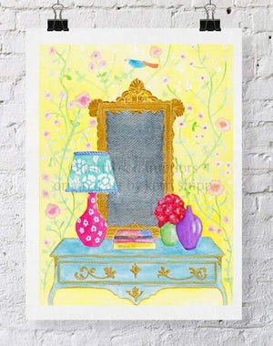 The Interior Portrait series celebrates gorgeous interiors; some are based on rooms designed by today's most talented interior designers, and others were born solely in my imagination. This painting is a combination of many gorgeous pieces I've found over the years, combined in a bright and pretty setting - a little 'jewel box' of a room.