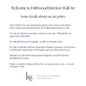 • Acid free, 300gsm textured watercolour paper is used for all prints, which maintains as much detail and depth of the original watercolour paintings as possible.